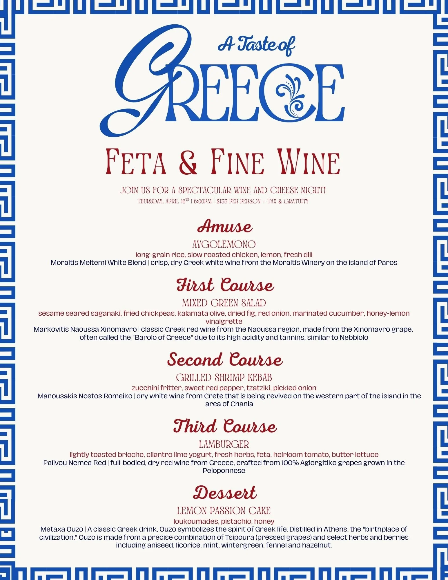 Step away from the everyday and join us for a night inspired by the flavors, wines, and traditions of Greece.
