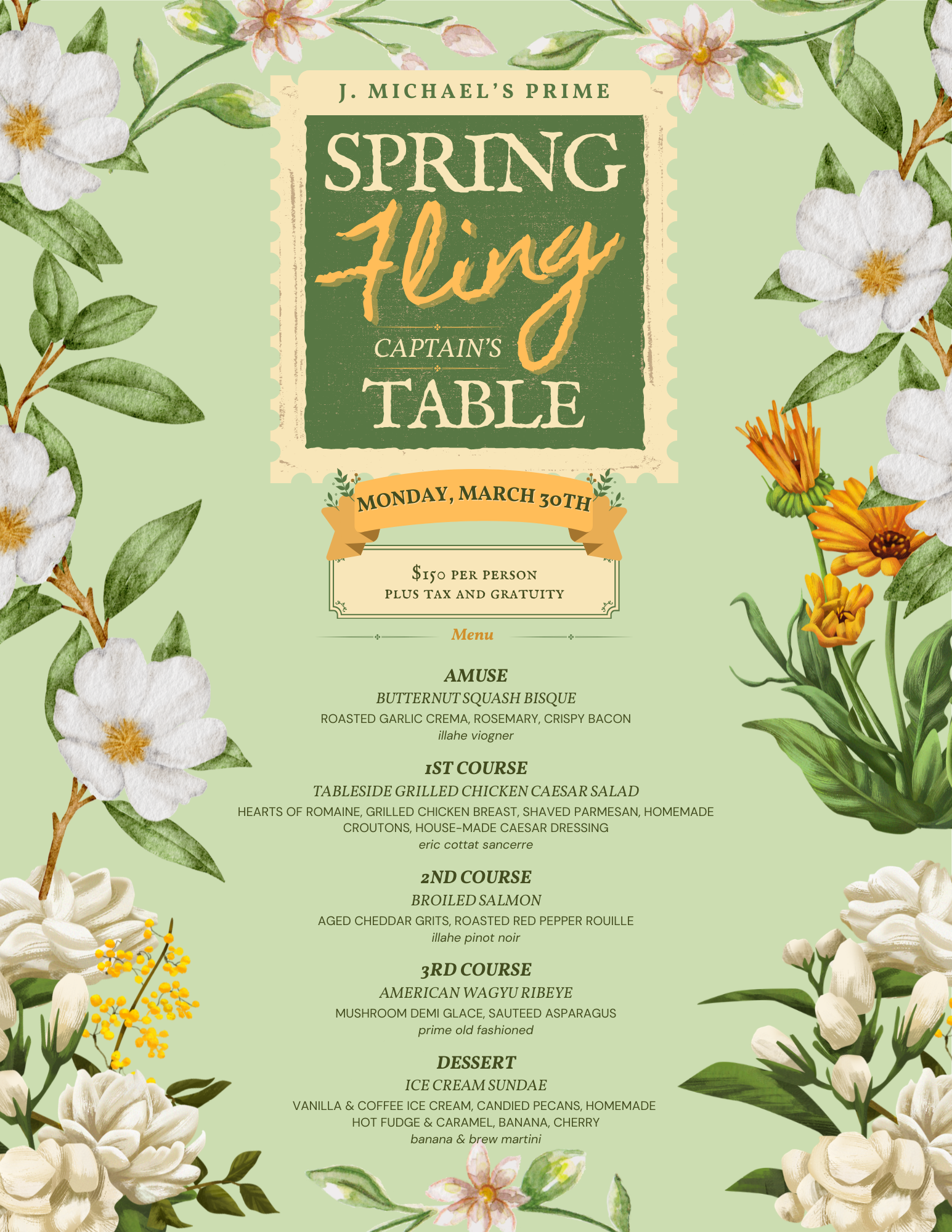 Experience one of the most exclusive dining opportunities at J. Michael’s Prime with our Captain’s Table: Spring Fling.